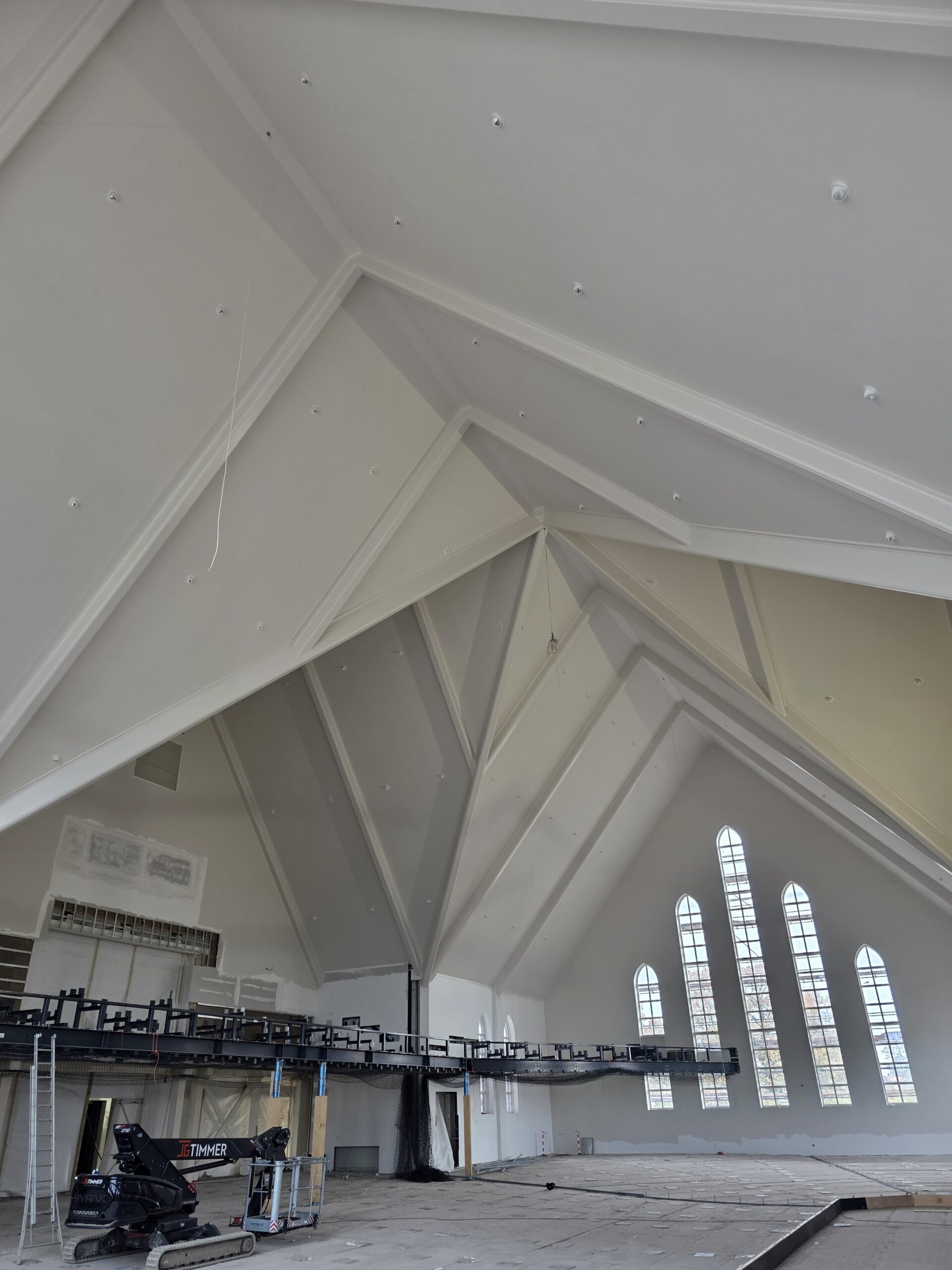 We zijn gestart met de afbouw van de Gereformeerde Gemeente in Kesteren. Op dit moment zijn we bezig met het aanbrengen van de metal stud plafonds, een belangrijke stap richting de verdere afwerking van het interieur.